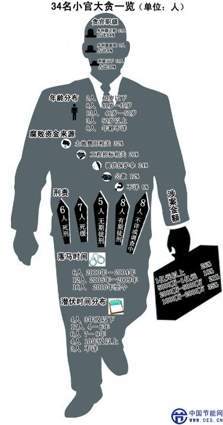 记者特此盘点自2000年来,涉案金额超过1000万人民币的34名乡科级及以下贪腐官员发现,这些“巨贪的小官”,特征为:六成是乡科级一把手、落马年龄集中在41岁~50岁、“潜伏时间”多为6年。